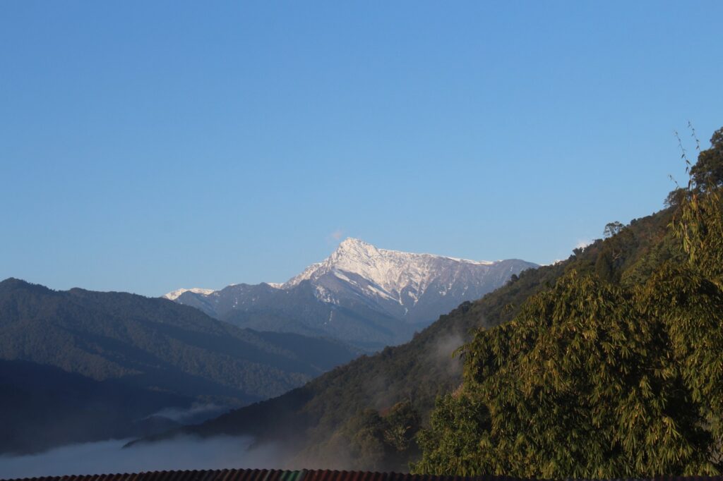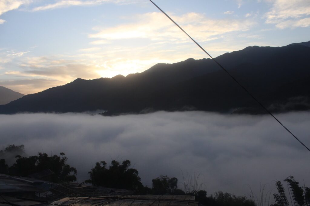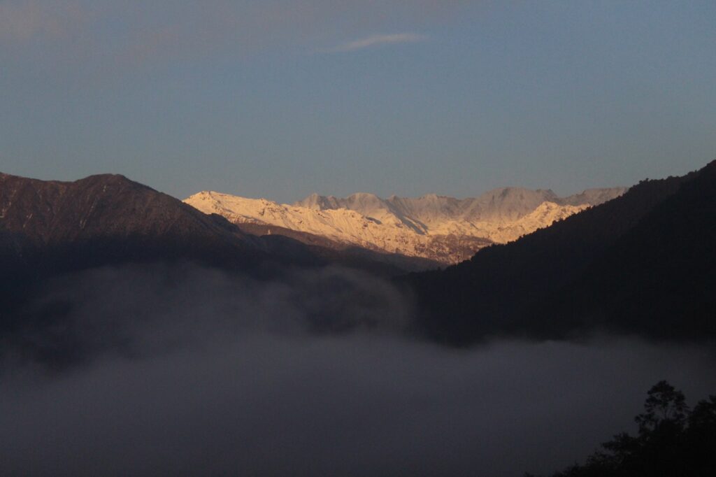 বৃষ্টি ঝরছিল অবিরাম। তার উপর এই ক’দিনের দুর্বিষহ যাত্রা। সকলে বেশ এলিয়ে পড়েছিলুম। এখানে দু’রাত কাটাব। তাই সে দিন আর বাংলো ছেড়ে বেরোলাম না। পরদিন বেশ সকালেই ঘুম থেকে উঠেছিলুম আমি। অন্যরা ওঠেনি তখনও। জানালা দিয়ে দেখলুম সবে পুবদিক রাঙা হয়েছে। ক্যামেরা হাতে বেরিয়ে পড়লুম একাই। যা দৃশ্য দেখলুম তা বঙ্কিমবাবুর ভাষায় বললে “জন্মজন্মান্তরেও ভুলিব না।“ উদিত সূর্যের আলো ঠিকরে পড়ছে দূরের বরফ ঢাকা পাহাড় থেকে। সামনের সবুজ পাহাড়। সে পাহাড় আমি যেখানে দাঁড়িয়ে ছবি তুলছি তার থেকে সামান্য উঁচু। আমার আর সেই পাহাড়ের মাঝের ভ্যালি সাদা মেঘের চাদরে ঢাকা। আকাশে না থেকেও আমি তখন মেঘের উপরে। আমার হাতের কাছেই মেঘ। আমি ছুটে বাংলোয় ফিরলুম। ডাক দিলুম সতীর্থদের সেই ঐশ্বরিক দৃশ্যের সাক্ষী হতে। আমার হাঁকডাকে তিনজনেই পাশ ফিরল শুধু। ঘুম থেকে উঠল না।